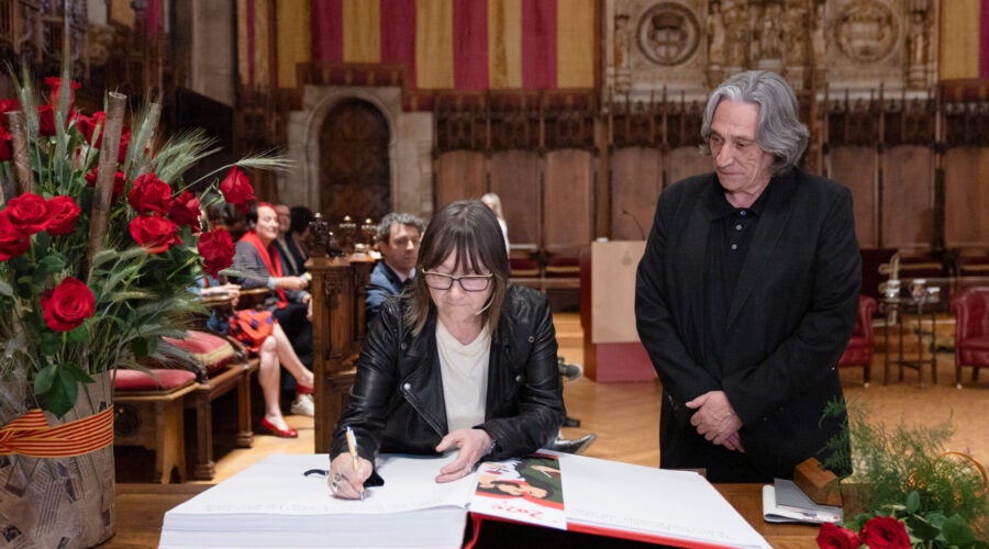 Una volta dins del Saló de Cent, tot és grandiós: les llànties, els tapissos, l’altura, la dimensió de la sala, els enteixinats, els seients envellutats als laterals, disposats per a les cerimònies. Hi ha silenci i expectació, roses i més roses. L’Ali Smith fa el pregó: un pregó intens, reivindicatiu, confessional, encoratjador, una mena de crit pel llibre, ja no com a objecte, sinó com a aixopluc i reserva de l’ànima, refugi individual i col·lectiu: “Estic feta un 75 % d’aigua, però un 90% de llibres”, diu, “tots els meus llibres estan fets d’altres llibres, és com si ja estigueren en mi, només he de cavar en mi i treure’ls”, “les biblioteques són el vertader cervell del món, hem de protegir-les”, diu l’escriptora escocesa. I “tant de bo Sant Jordi es fes contagiós”, desitjava Ali Smith, “perquè no he vist mai una ciutat que faça res semblant, que celebre els llibres i la vida com Barcelona”. I és cert que, amb tots els seus ets i uts, que en són molts, la festa de Sant Jordi és grandiosa.