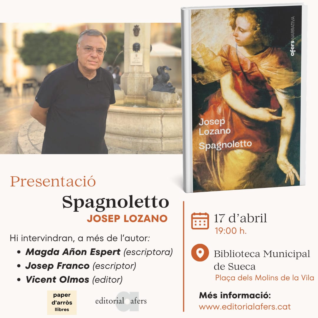 L’escriptor d’Alginet (la Ribera Alta) Josep Lozano presenta la seua última novel·la, Spagnoletto (Afers, 2026), a la Biblioteca Municipal de Sueca (la Ribera Baixa) aquest divendres, 17 d’abril, a les 19 h. En l’acte, hi intervindran l’escriptora Magda Añón, l’escriptor Josep Franco i l’editor Vicent Olmos.