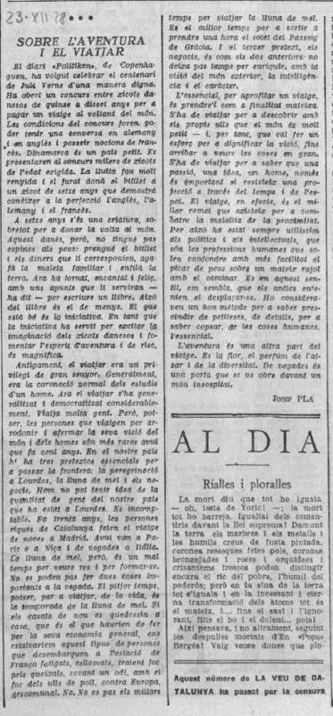 L’any 1928 Josep Pla va publicar a La Veu de Catalunya un article, «Sobre l’aventura i el viatjar», una mena de poètica del viatge suggerida per la lectura d’un fet divers trobat a la premsa —un premi literari convocat per un periòdic danès per als estudiants amb motiu del centenari de Jules Verne—: el premi era, evidentment, una volta al món, encara que no fos obligatori fer-la en vuitanta dies. El jove premiat havia tornat del seu premi amb uns apunts que li servirien —deia— per escriure un llibre. «Això del llibre rai. El que està bé és la iniciativa. En tant que iniciativa ha servit per a excitar la imaginació dels xicots danesos i fomentar l’esperit d’aventura i de risc, és magnífica». Més enllà de l’anècdota a què Pla treu punta, el cert és que el seu article és tot una poètica personal, i explica molt bé com la seva mirada de periodista va anar formant-se, i fusionant-se, amb la del viatge, que no és simplement el desplaçament.