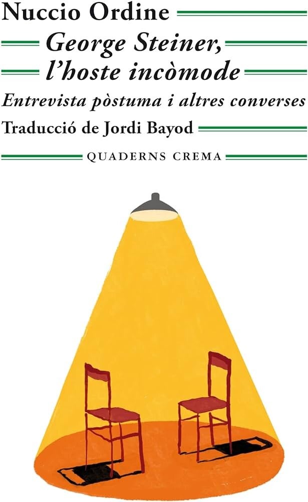 Hi ha llibres petits que són molt grans, George Steiner, l’hoste incòmode, n’és un. Un volum amb a penes cent pàgines, obra del recentment desaparegut Nuccio Ordine, autor de La utilitat de l’inútil, i una crònica honesta i emotiva de l’amistat i complicitat intel·lectual entre Ordine i Steiner. A més d’un assaig d’Ordine sobre Steiner, el llibre recull unes quantes entrevistes amb l’assagista, professor, erudit i crític literari, aparegudes en el Corriere de la Sera, incloent-hi la impactant “entrevista pòstuma”, publicada també allí el 4 de febrer de 2020, just després de la seua mort, com s’havia acordat. En ella Steiner parla, amb la sinceritat i el sentit de justícia que el caracteritzaven, dels grans temes que el van preocupar sempre: la crítica literària, les humanitats, la idea d’Europa, el sionisme i el judaisme, entre altres temes.