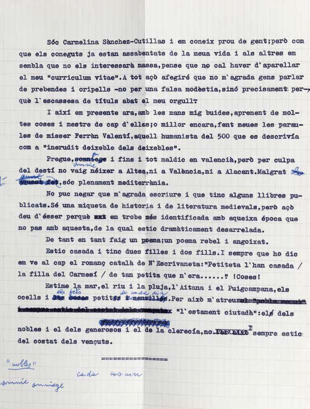 Tanca l’Obra completa la veu autobiogràfica de Carmelina Sánchez-Cutillas qui, gelosa de la seua intimitat, hi va concedir molt poques escletxes d’accés, en vida. Una entrevista poc coneguda de Rafael Ventura Melià, del 1979; una altra, el 2008, al programa Café Montcau de Ràdio Altea (transcrita en aquest mateix monogràfic de La Veu per un dels autors, Joan Borja). Fins i tot va ocultar el seu any de naixement, contribuint així a l’aura de misteri i hermetisme de què sempre va voler envoltar-se. Tanmateix, cent anys després de la data en què va nàixer (desvelada fa poc: el 23 de juny de 1921), llegirem per fi una veu intensa, lírica, profundament melangiosa, en el diari manuscrit que hem pogut transcriure per a l’Obra completa. La veu íntima de l’autora es combinarà amb la veu potent, sàvia, de l’escriptora que presenta actes, que fa discursos, que parla de les relacions entre dona i literatura, que reflexiona sobre la seua obra i la creació literària en general.