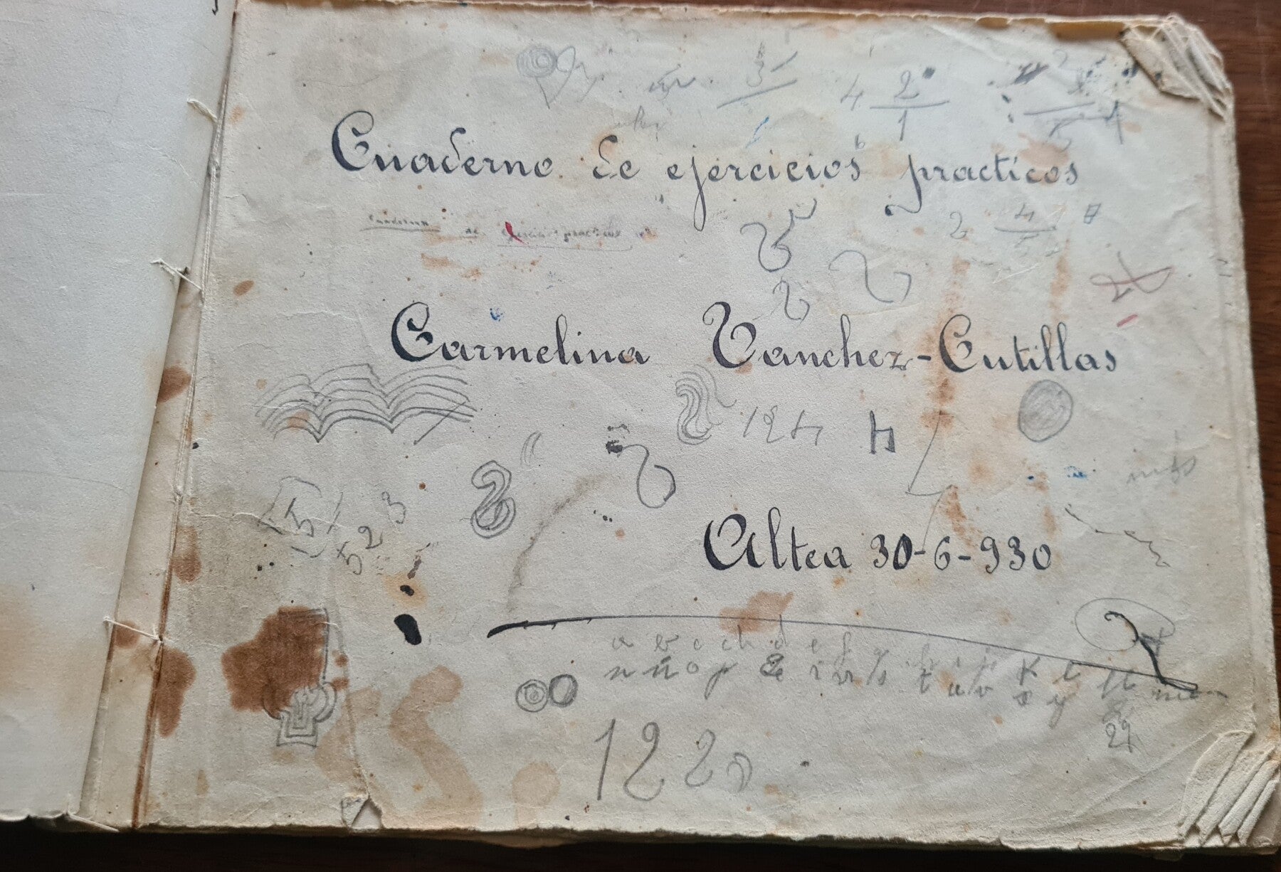 De fet, jo tinc un record molt curiós i preciós. Mira el que conserve: el quadern d’exercicis de Carmelina en Altea.