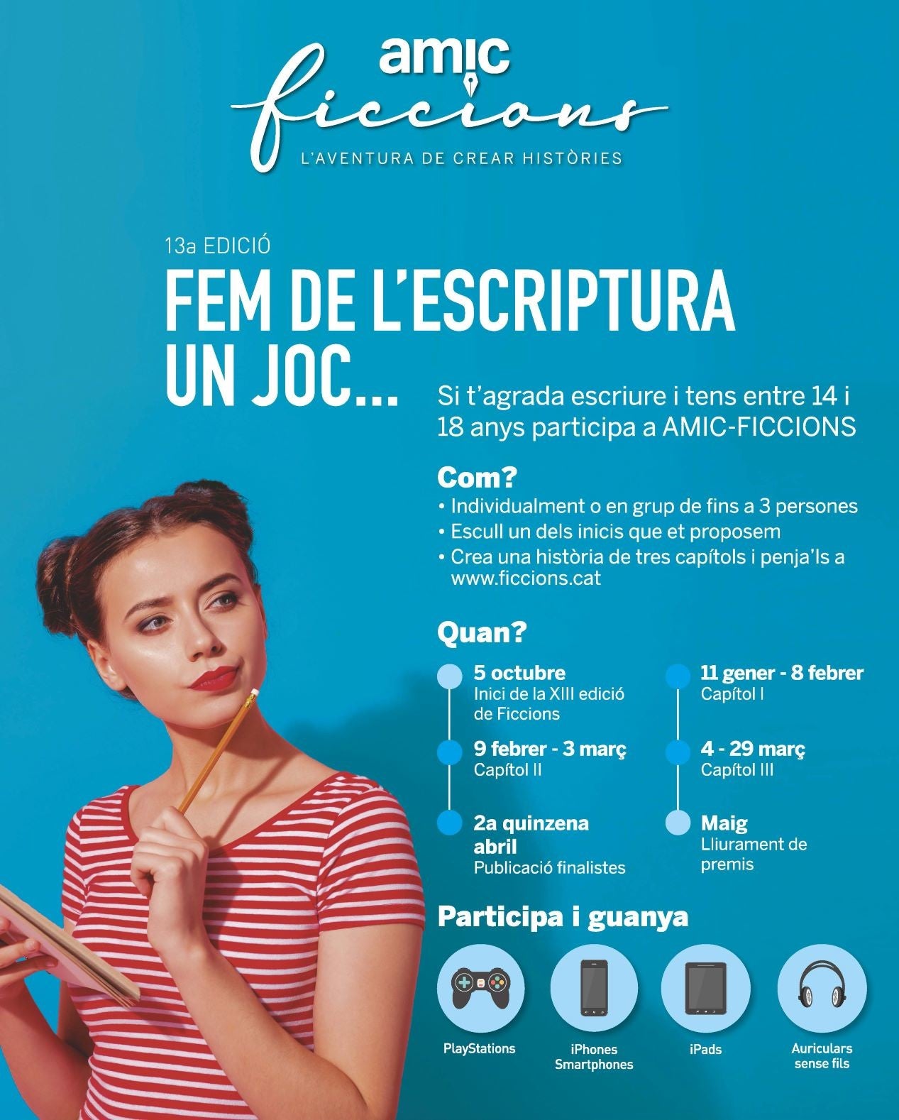 “AMIC-FICCIONS, l’aventura de crear històries” és un concurs de creació literària per a joves que aquest curs arriba a la seva tretzena edició. L’any passat hi van participar més de 3.660 estudiants de segon cicle d’ESO, Batxillerat i CFGM de Catalunya, Illes Balears i País Valencià. Des del 5 d’octubre de 2020 i fins al 8 de febrer els estudiants que vulguin participar es poden registrar a través del web www.ficcions.cat.