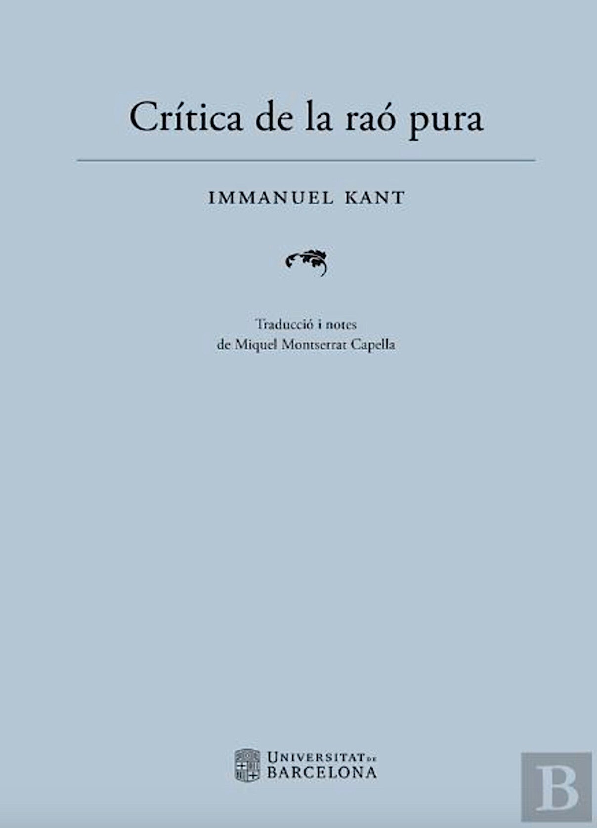 En aquest cas es tracta d’una edició cuidada, tant en l’aspecte material com formal: una traducció acurada, amb notes, ben presentada –ben maquetada, amb una tipografia agradable que es deixa llegir molt bé–, amb l’acompanyament al marge de la paginació original –canònica– de les dues edicions originals, la de 1781 i la de 1787: acadèmicament impecable. Caldrà felicitar Josep Montserrat, director de la col·lecció Filosofia UB Sèrie Magna per aquesta iniciativa. I atorgar el nostre agraïment més gran a Miquel Monserrat Capella per haver realitzat un esforç tan considerable i exigent com és traduir una obra de tanta importància i tan complexa com la Crítica de la raó pura (CRP) i de fer-ho amb tant de rigor.