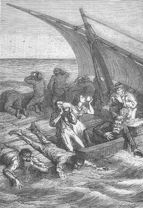 Per una sèrie de motius que no venen a tomb —tampoc no us en voldria fer un espòiler absolut—, el vaixell naufraga i els supervivents acaben en un rai al mig de l’Atlàntic, a mercè de les tempestes, amb una calor com més va més insuportable a mesura que s’acosten al tròpic, i, com el lector s’imagina tot d’una, abocats a patir una fam i una set i unes penúries que els portaran fins als extrems més indescriptibles, fins i tot salvatges: