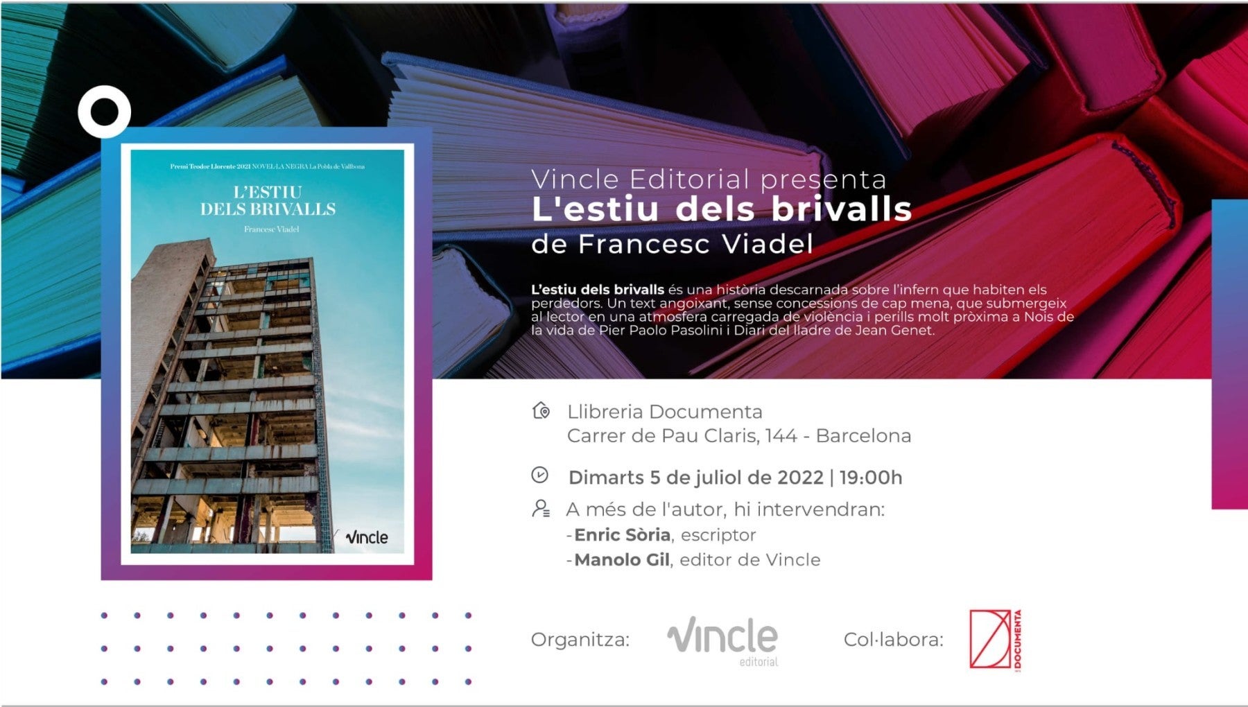 Francesc Viadel presenta aquest dimarts a la llibreria Documenta de Barcelona la seua última novel·la L’estiu dels brivalls (Vincle Editorial), obra guanyadora del Premi Teodor Llorente 2021 de novel·la negra de la Pobla de Vallbona (el Camp de Túria). A més de l’autor, hi intervindran l’escriptor Enric Sòria i l’editor Manolo Gil.
