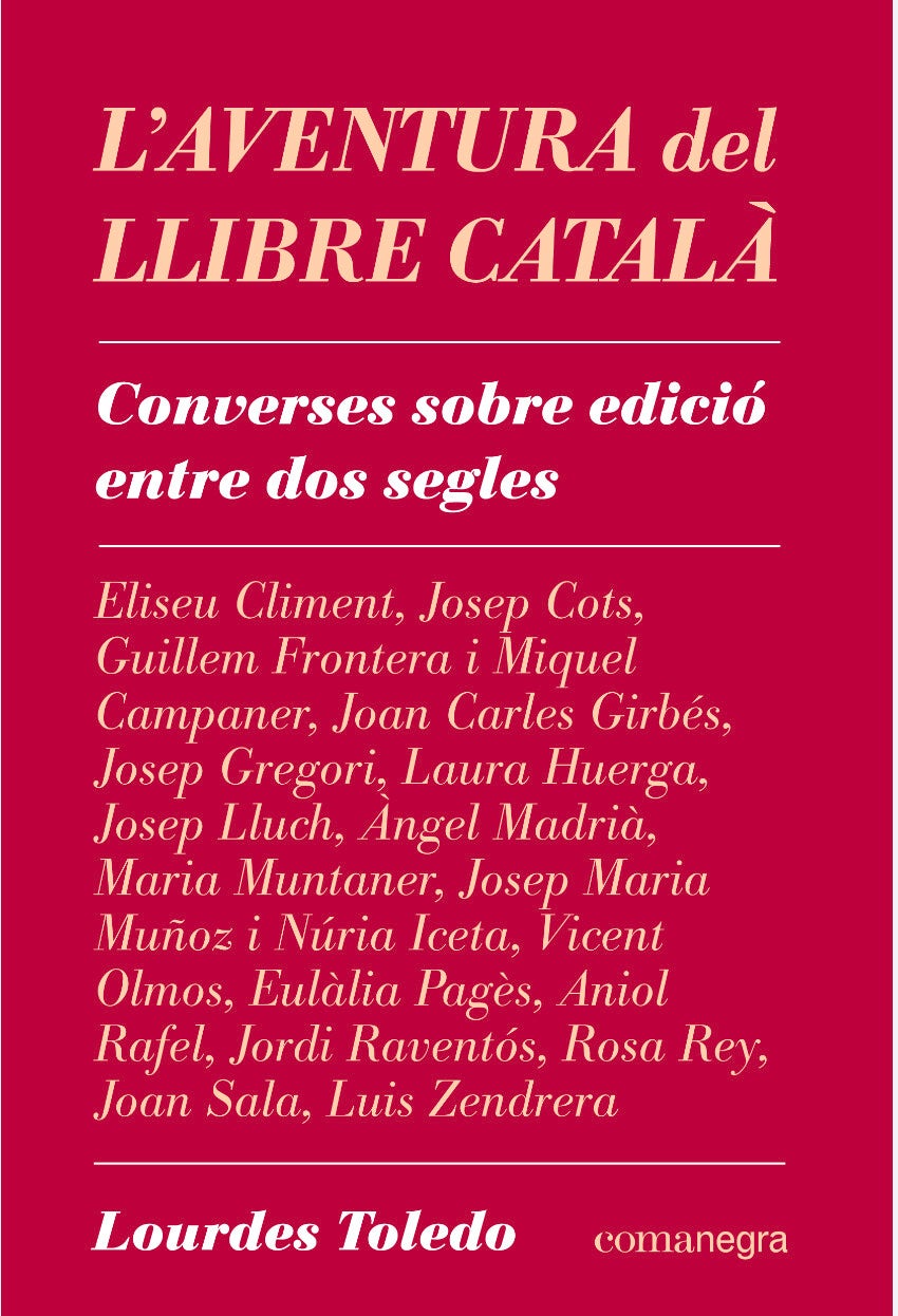 L’autora posa l’accent en temàtiques concretes, però L’aventura del llibre català és el reflex de les persones triades. “Tota tria és problemàtica”, reconeix Toledo en la introducció abans de defensar una nòmina basada en criteris generacionals, territorials i de diversitat: Eliseu Climent (Tres i Quatre), Josep Cots (Edicions de 1984), Guillem Frontera i Miquel Campaner (Ensiola), Joan Carles Girbés (Ara Llibres, Amsterdam, Bernat Metge), Josep Gregori (Bromera), Laura Huerga (Raig Verd), Josep Lluch (Proa, Empúries), Maria Muntaner (Lleonard Muntaner), Josep Maria Muñoz i Núria Iceta (L’Avenç), Vicent Olmos (Afers), Eulàlia Pagès (Pagès Editors), Aniol Rafael (Periscopi), Jordi Raventós (Adesiara), Rosa Rey (Angle), Joan Sala (Comanegra) i Luis Zendrera (Editorial Joventut).
