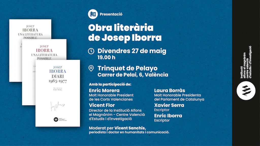 Els tres primers volums de l’Obra literària, de Josep Iborra, publicats per la Institució Alfons el Magnànim, es presentaran aquest divendres, 27 de maig, a les 19 h, al Trinquet de Pelai de València en un acte en què intervindran Enric Morera, president de les Corts Valencianes; Laura Borràs, presidenta del Parlament de Catalunya; Vicent Flor, director de la Institució Alfons el Magnànim; Xavier Serra, escriptor i autor d’una biografia de l’autor, i Enric Iborra. Vicent Sanchis, periodista i doctor en humanitats i comunicació, hi farà de moderador.