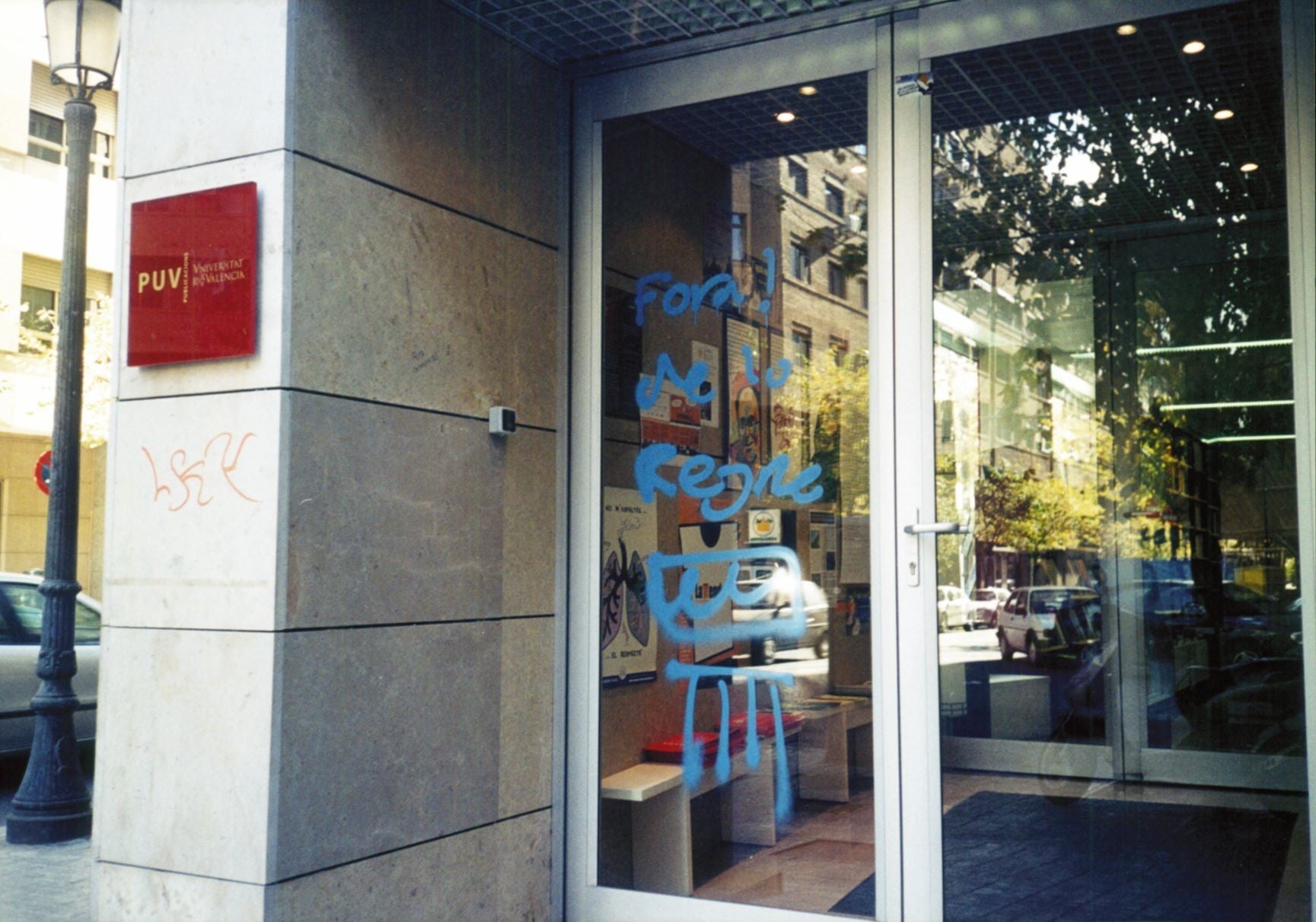 No debades, Publicacions de la Universitat de València ha estat objecte en alguna ocasió d’atacs vandàlics perpetrats per energúmens virulents. Les pintades barroeres als aparadors exteriors de la llibreria en són una mostra fefaent i vergonyant.
