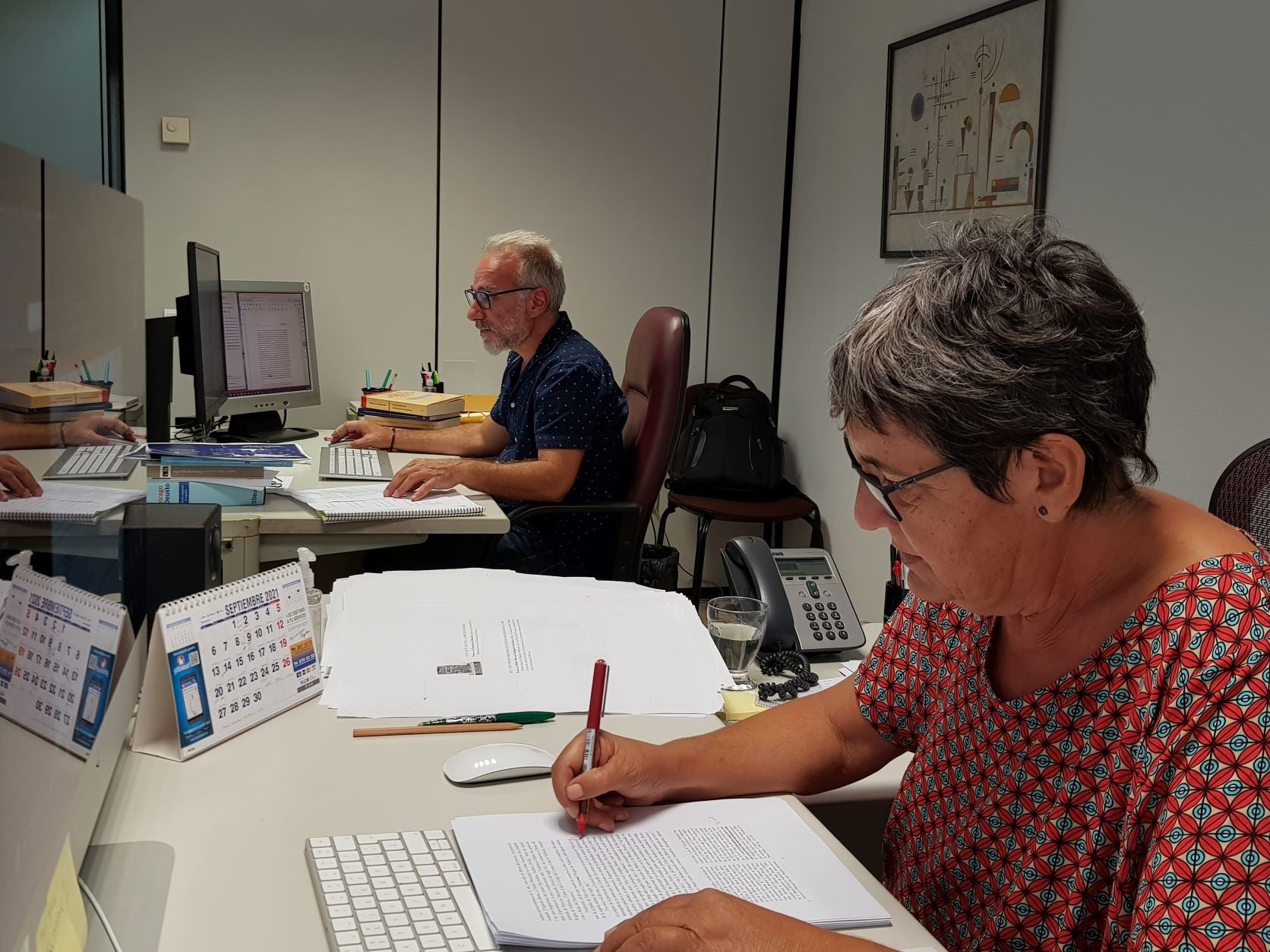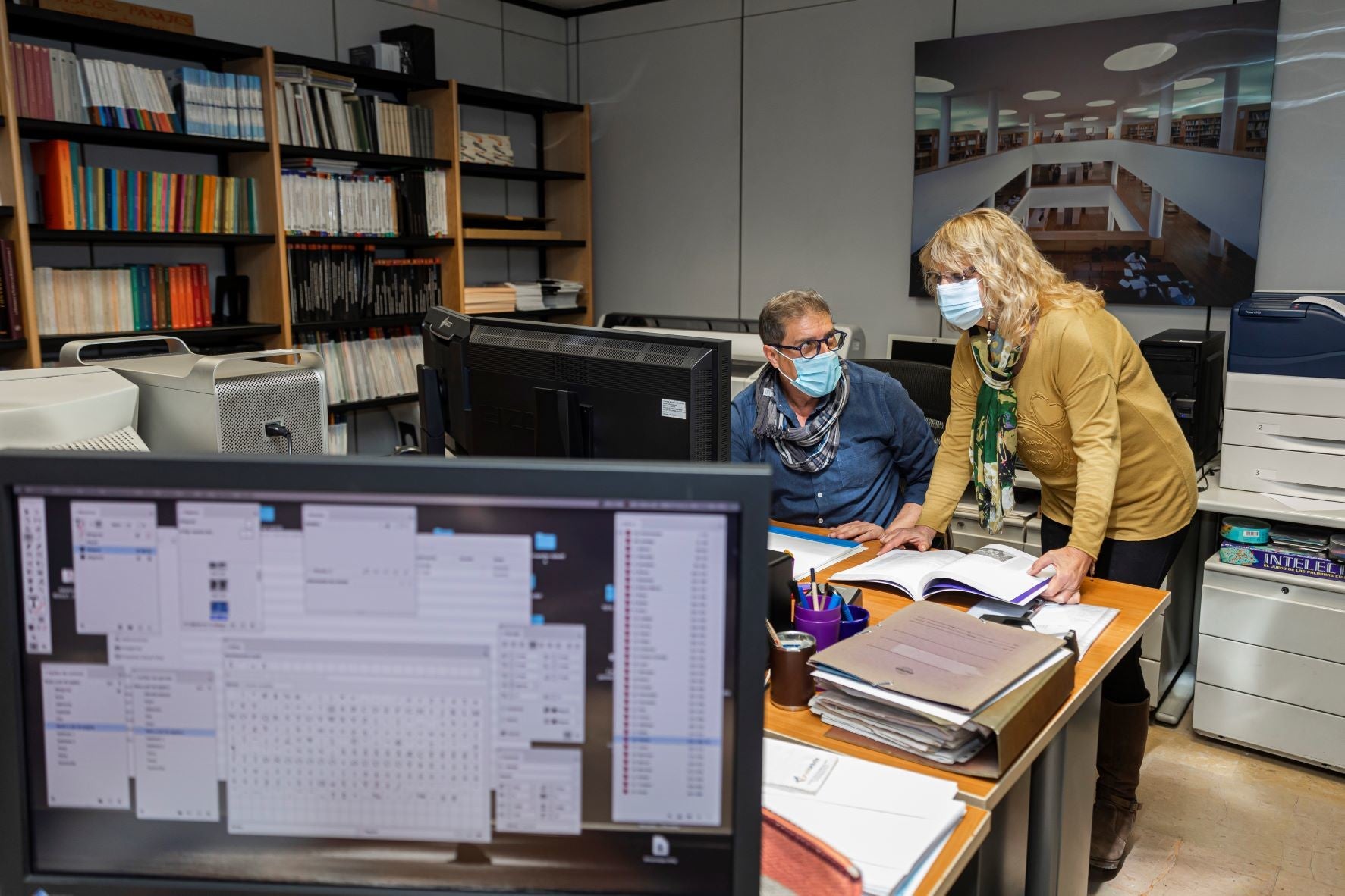 D’això, en saben molt Inmaculada Mesa i Celso Hernández, que s’encarreguen de la maquetació i del disseny dels llibres de PUV, respectivament. Inma porta més de quaranta anys a PUV, des que en tenia díhuit. La seua trajectòria hi ha estat vinculada completament i recorda, somrient, com eren els seus inicis al Servei. «Era tot tan incipient… Jo vaig començar amb una màquina manual. Després, vam passar a l’elèctrica. Més tard, vam treballar amb la compugraphic. Era molt rudimentària perquè calia canviar-ne la configuració manualment per modificar el tipus de lletra, de redona a cursiva, per exemple. Fèiem les coses molt a poc a poc… Tallant els diferents components de la pàgina per poder-los passar a fotolits. Mire els llibres que fèiem fa trenta o quaranta anys i quasi em fa vergonya. Ara ho fem infinitament millor, però aleshores era el que hi havia. Era normal.»