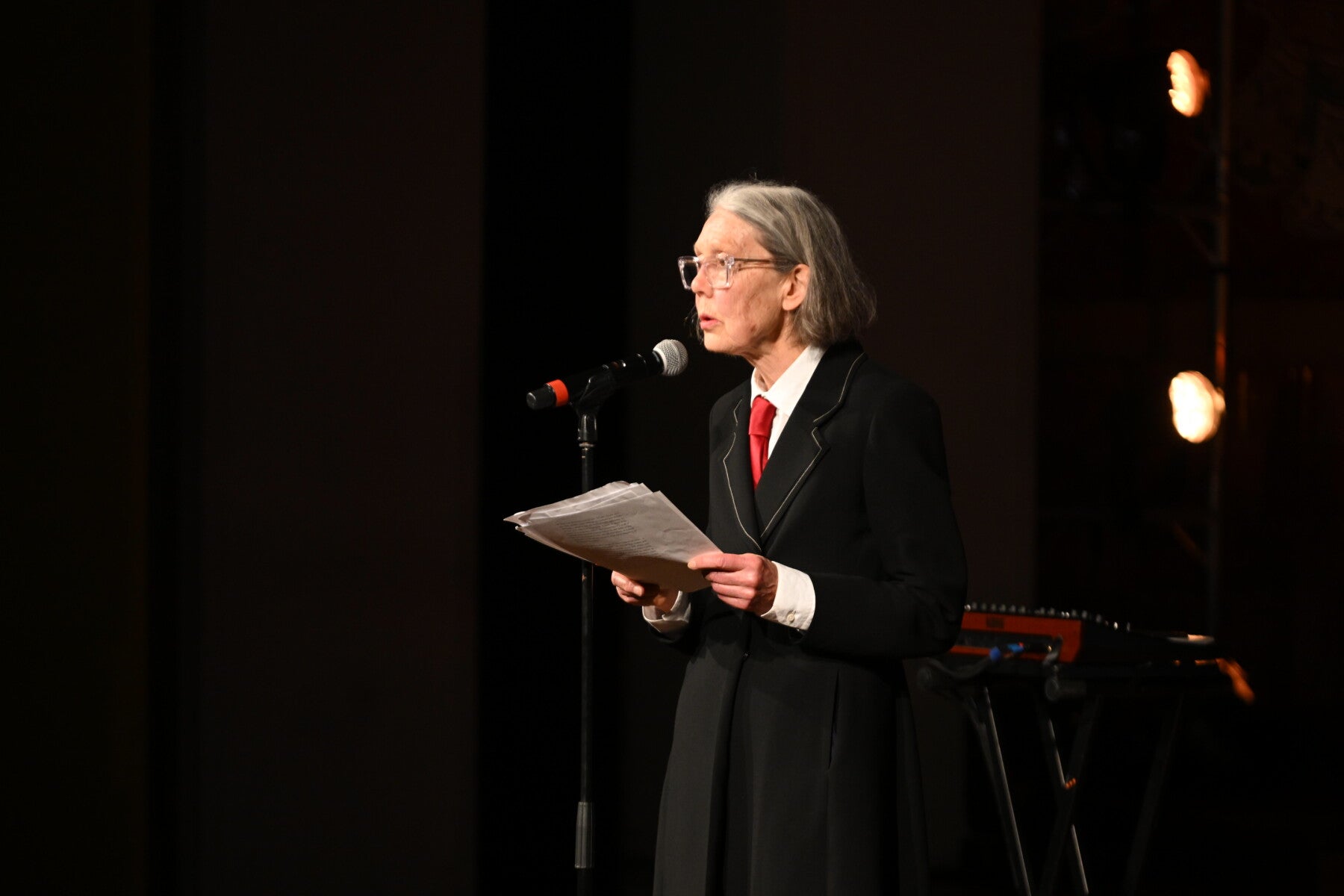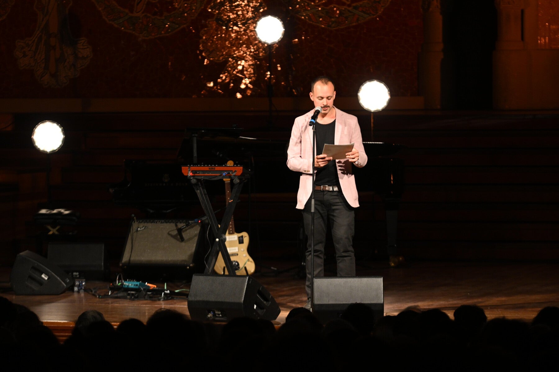 La canadenca va ser la darrera rapsoda a la Nit del Palau, la precediren Shota Iatashvili de Geòrgia amb una Carta d’antimotivació; la gallega Lupe Gómez amb les seves imatges tan breus com trasbalsadores –“L’amor de les coses / feia mal com la veu / d’un gos ferit que / venia des de molt lluny”–; hem jugat al tetris amb l’hongarès Márton Simon – “això és el temps més sagrat, / el que malgastem junts”–; ens hem qüestionat el silenci amb Berta García Faet –¿Escuchas el silencio histriónico del imperativo abrázame y, / verbalizándolo, me abrazas?”–; la recentment traduïda del romanès al català per Cafè Central, Ana Blandiana, ha corprès la sala sencera amb el seu Joc –“Jugo amb els nens que esdevindran adults / […] massa més, / Mentre jo em quedo sola a la infantesa”. Adrià Targa introdueix l’espectacle in medias res, a punt per ser el tercer element, ens fa morir el paradís a les nostres mans. En definitiva, una nit completa i connexa gràcies als interludis musicals de Clara Aguilar, una intèrpret absolutament polivalent, i la intervenció final d’Anna Andreu.