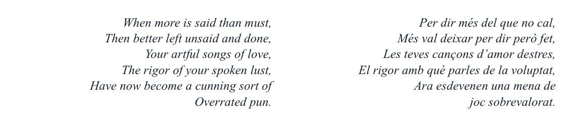 Gabriel va fer arribar a Jill una traducció –de fet, amb tres variants– del seu poema “A l’inrevés”, també de “By Natural Piety” i “Les mosques d’octubre”. Allà va començar un diàleg entre dues ànimes solitàries que es van entrecreuar i que, mentre s’allunyaven per viatges, no s’acabaven de deixar anar.