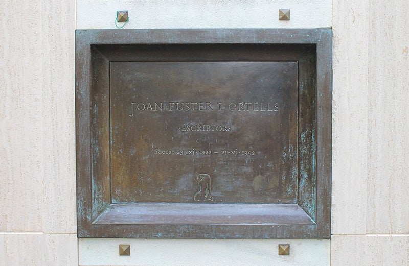 Ara ja als afores del poble, a frec del riu Xúquer, es troba el Cementeri de Sueca. La afluència escassa de visitants, els xiprers austers, alguns pocs panteons ornats amb elements al·legòrics i el silenci propi d’aquests llocs fan del cementeri una visita agradosament bucòlica. La tomba de l’escriptor, fàcilment localitzable, està en «el panteó de fills il·lustres de la ciutat», una làpida bella i senzilla, dissenyada per l’artista plàstic Manuel Boix, amb la inscripció: «Joan Fuster i Ortells. Escriptor. Sueca, 23·xi·1922 – 21·vi·1992». L’únic motiu que l’adorna és el dibuix evocador d’un àngel caigut, obra del mateix Fuster, amb què il·lustrà la coberta del seu poemari Ales o mans. No és d’estranyar que algun visitant quede decebut en no trobar-hi cisellat l’epitafi irònic que l’assagista va escriure en el poema «segona conclusió»: