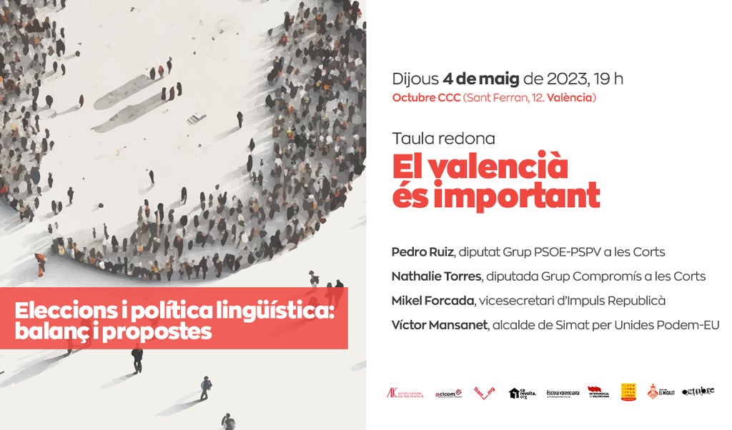 Acció Cultural, juntament amb altres entitats i organitzacions que treballen per la llengua (ACICOM, ACT Tirant, Ca Revolta, Escola Valenciana, Intersindical valenciana, Plataforma per la llengua i Societat Coral el Micalet), organitzen el dia 4 de maig del 2023 a les 19 h a l’Octubre Centre de Cultura Contemporània de València –carrer de Sant Ferran 12– una taula redona amb els representants de diferents partits polítics que es presentaran a les pròximes eleccions el 28 de maig.