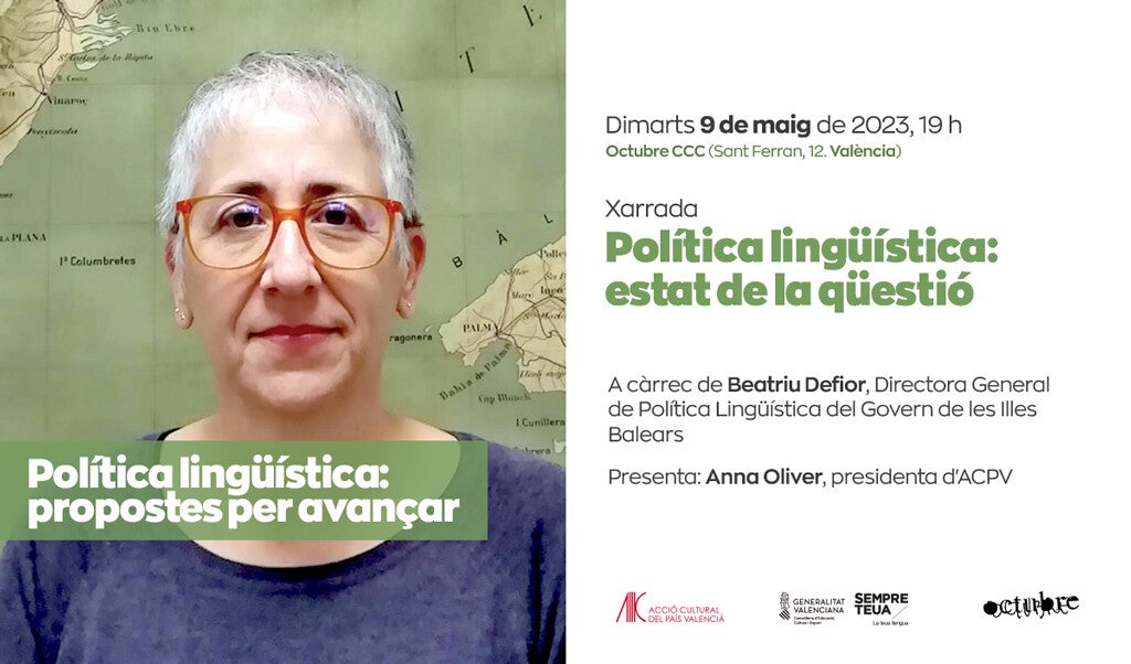 El pròxim dimarts 9 de maig, a les 19 hores a l’Octubre Centre de Cultura Contemporània –carrer de Sant Ferran 12, València–, tindrà lloc la xarrada «Política Lingüística: estat de la qüestió» amb Beatriu Defior, directora general de Política Lingüística del Govern de les Illes Balears. La xarrada està emmarcada dins del cicle «Política lingüística: propostes per avançar».