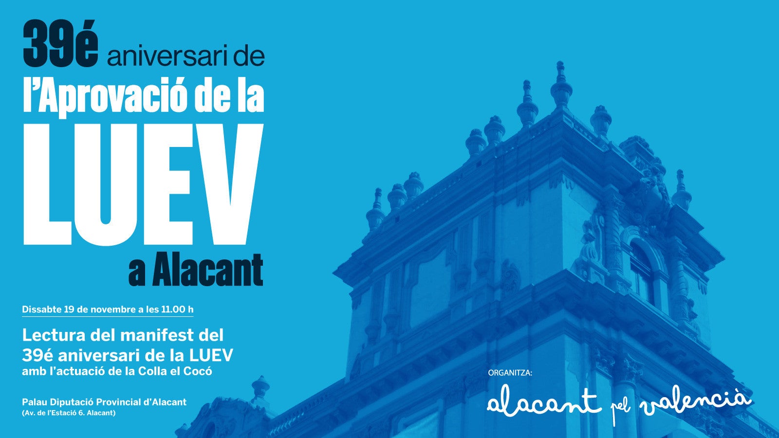 Alacant acollirà un acte commemoratiu pel 39é aniversari de la Llei d’Ús i Ensenyament del Valencià. Ho farà aquest dissabte 19 de novembre al palau de la Diputació d’Alacant, on la plataforma Alacant pel Valencià, integrada per més d’una vintena d’entitats favorables a la normalització de la llengua autòctona de la ciutat, ha organitzat l’esdeveniment.