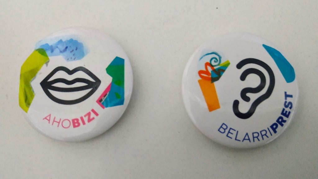 Un dels elements més representatius d’Euskaraldia és l’ús de dos tipus de xapes que molta gent s’enganxa a la roba: en una apareix una boca i el lema “AHO BIZI”, que ve a ser “boca viva”, i en l’altra hi ha una orella dibuixada i el lema “BELARRI PREST”, que vol dir “orella preparada (o disposada)”. Vegeu-ne la foto.