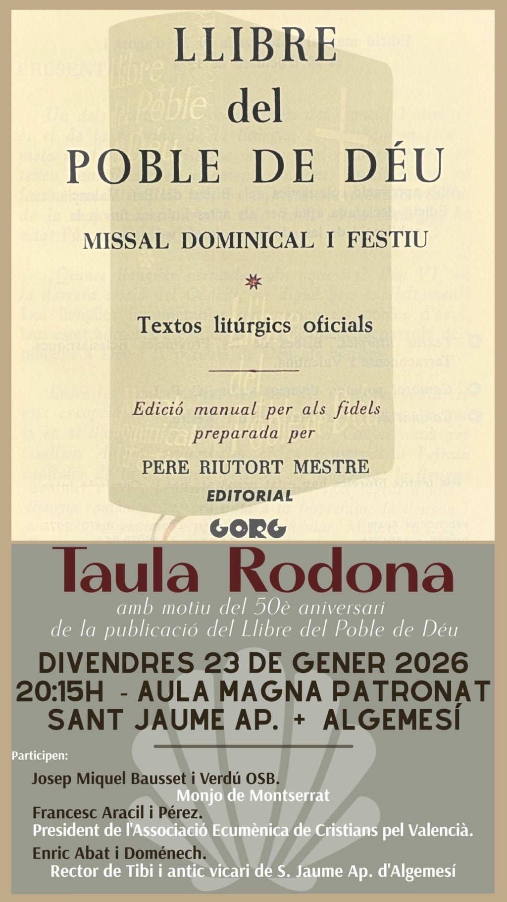 Aprofitant que estic passant uns dies a l’Alcúdia, demà 23 de gener, el rector d’Algemesí, Joan Carles Alemany i els amics Vicent Niclòs i la seua esposa Alícia Llorca, m’han convidat a participar en una taula rodona (amb Francesc Aracil, president de l’Associació Ecumènica de Cristians pel Valencianisme i Enric Abat, antic vicari d’Algemesí), per tal de commemorar (ja que els bisbes valencians no ho fan), els 50 anys de la publicació del Llibre del Poble de Déu, Missal Dominical i Festiu, edició manual per als fidels preparada pel P. Pere Riutort Mestre, insigne filòleg, liturgista i pedagog.