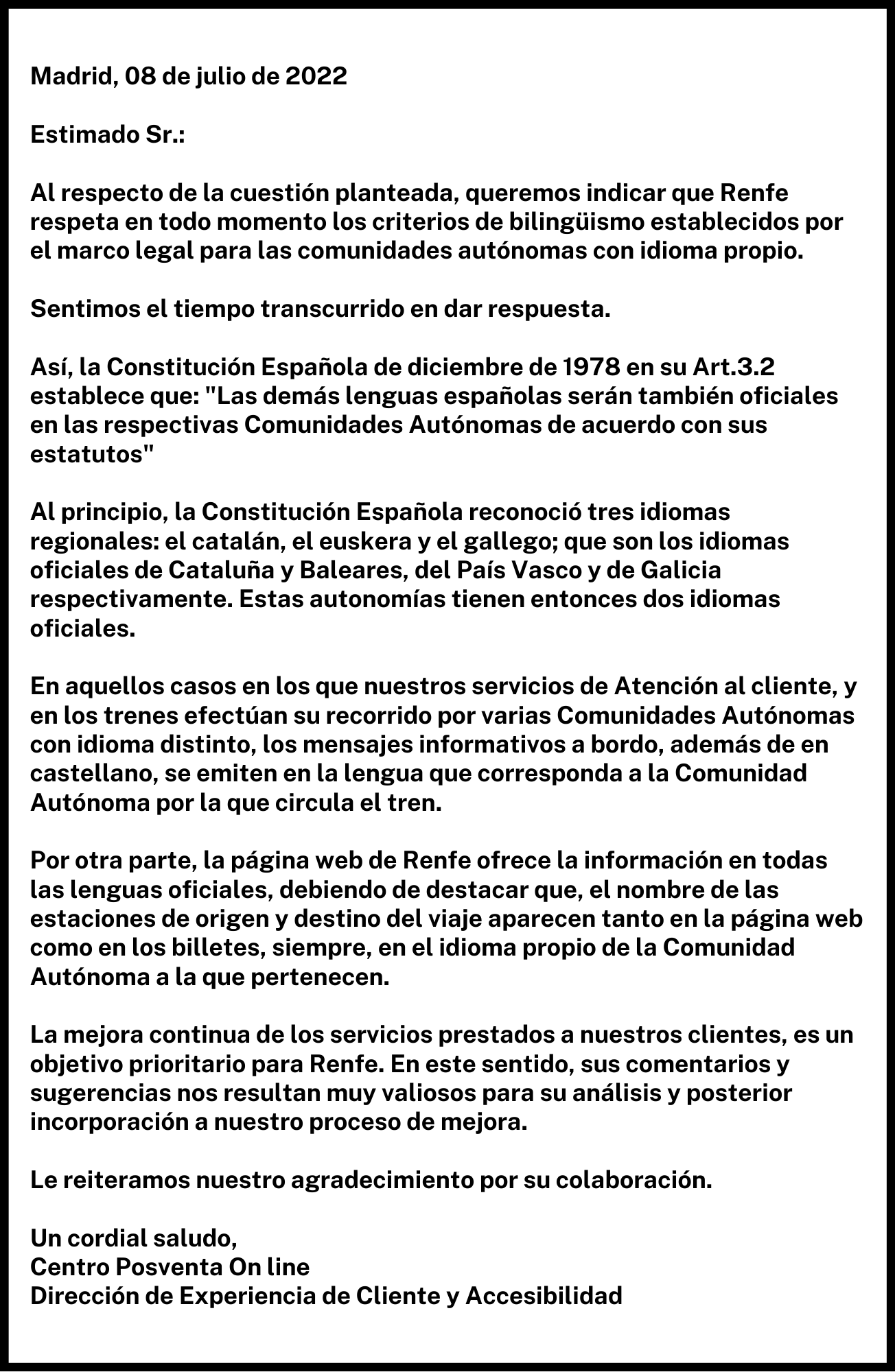 Quant a la resposta des de Madrid, l’usuari apunta: «Potser des de Madrid, l’Estat i els responsables d’Adif o Renfe consideren que la Constitució espanyola del 1978 va delimitar les altres llengües distintes del castellà (català, èuscar i gallec), cosa que per desgràcia no es va fer i tenim llengües sense nom, una llengua amb funcions supremacistes i les altres subordinades, i un “Estatut” (de segona o tercera) que va deixar sl País Valencià sense especificar de manera adequada quina llengua parlem, perquè, des de Madrid, on es va aprovar l’Estatutet, potser consideren que tots parlem o hauríem de parlar el castellà i prou».