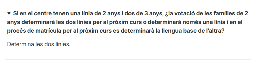 “Si queda qualsevol dubte a la interpretació”, afegeix Escola Valenciana, “a les FAQ de la Conselleria queda clar”. A una pregunta específica sobre com es determina la llengua base a un centre amb dos grups de tres anys i un grup de dos anys, la resposta és clara: la llengua base de dos anys “determina les dues línies”.
