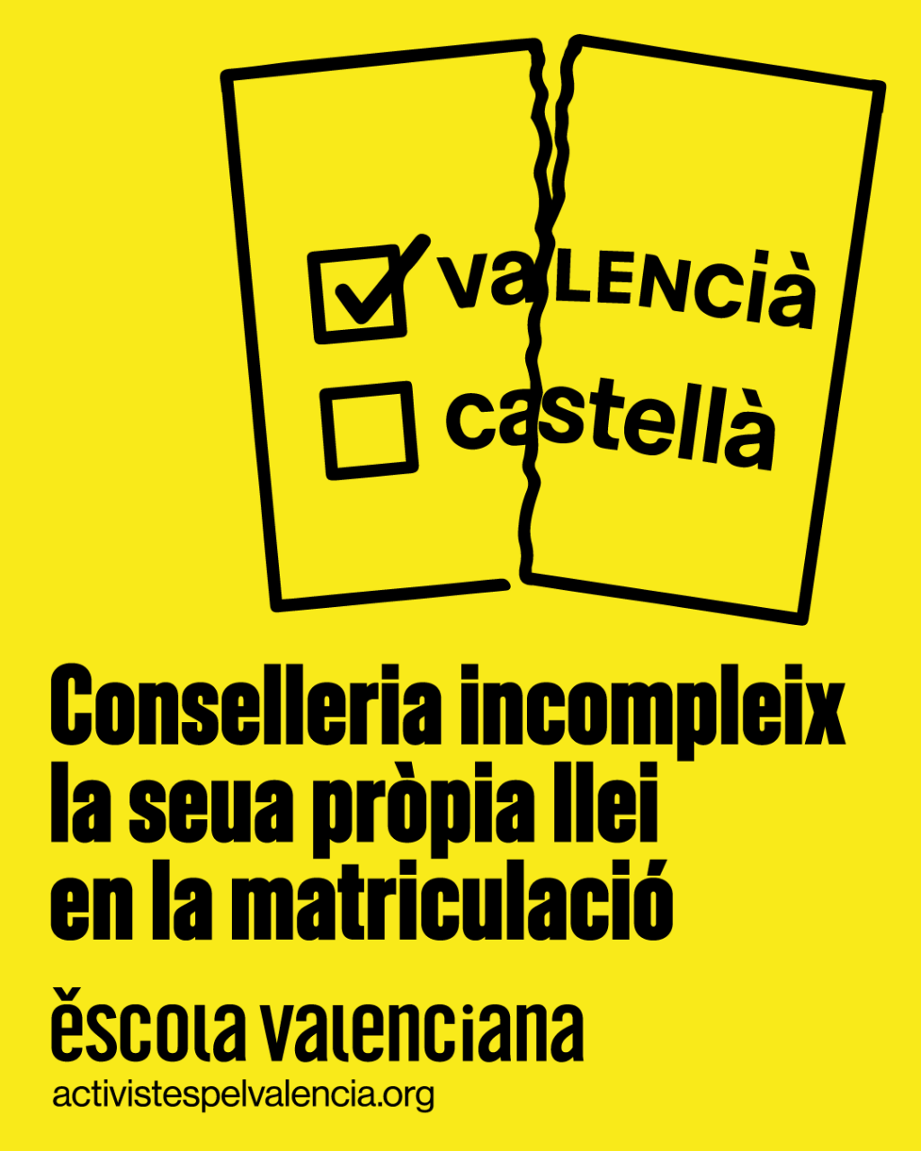 Encara així,l’entitat anima a “continuar demanant matricular-se en valencià”. Tot i que els centres ofereixen noves vacants en l’altra llengua, que pot ser valencià (minoritàriament) o castellà (majoritàriament), animen a sol·licitar plaça en la llengua pròpia, “garantia d’inclusió i igualtat per a les noves generacions”: “Si a un centre on tenien un grup de dos anys en valencià, hi ha ara dos aules de tres anys cadascuna en una llengua base, però la majoria de les sol·licituds es fan per a valencià… Què faran? Incomplir la seua llei?”, conclou.