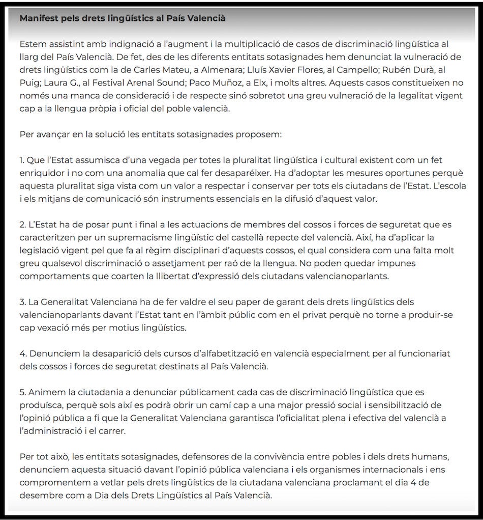 Aquell dia de fa nou anys els representants d’aquesta plataforma van presentar un escrit a la Delegació del govern espanyol al País Valencià en què s’explicitava la vulneració dels drets lingüístics dels valencianoparlants i van llegir un manifest. Una declaració que també van presentar a les Corts Valencianes, el Síndic de Greuges, el Consell Valencià de Cultura, les tres diputacions, el Congrés dels Diputats, el Parlament Europeu, l’Acadèmia Valenciana de la Llengua i l’Institut d’Estudis Catalans.