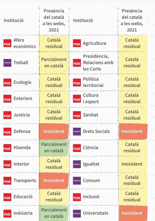 Des de l’entitat denuncien «la inacció» del Govern espanyol, que és «especialment destacable si es té en compte que des de l’any 2018 el dirigeix el PSOE i que des del 2020 ho fa en coalició amb Unides Podem». Tal com expliquen des de Plataforma, el PSOE reivindicava, l’any que va arribar al govern, «la plurinacionalitat», «el plurilingüisme» i «el respecte per la diversitat i pluralitat» de l’Estat espanyol. Unides Podem «ha defensat aquests principis, de paraula, de manera continuada i encara més enèrgica», diu l’entitat a l’informe, i aporta que a l’abril del 2022, En Comú Podem, la secció catalana d’Unides Podem, va presentar una proposició no de llei per a garantir que tots els webs de l’Estat estigueren disponibles en les llengües oficials diferents del castellà, «però la presència del català és molt defectuosa fins i tot als portals dels mateixos ministeris». I és que segons l’entitat, 15 dels 17 ministeris del PSOE tenien el 2021 webs amb alguna presència del català, «però en 13 dels casos era una presència residual en què només estaven traduïts els menús dels primers nivells de navegació i alguna informació estàtica». Plataforma assegura, a més, que els webs de Podem «encara estaven pitjor: en 3 dels 5 casos, no tenien cap contingut en català, i en un quart cas, la presència d’aquest idioma és residual».