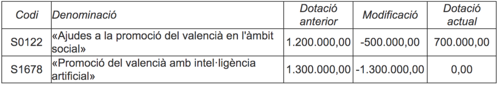 L’acord estableix una reducció directa en les dues línies pressupostàries vinculades a la promoció lingüística. D’una banda, la de les “ajudes a la promoció del valencià en l’àmbit social”, amb una dotació inicial d’1.200.000 euros, baixa a 700.000 euros. D’altra banda, la de la “Promoció del valencià amb intel·ligència artificial”, amb una dotació inicial d’1.300.000 euros, es queda sense fons.