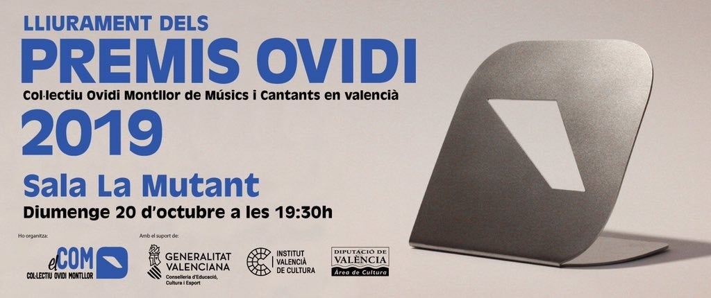 Este diumenge, 20 d’octubre, el Col·lectiu Ovidi Montllor celebrarà el catorzé lliurament dels Premis Ovidi: la gala, d’entrada lliure, començarà a les 19.30 a la sala La Mutant (València), amb la periodista alcoiana Amàlia Garrigós i el col·loquier suecà Eugeni Alemany com a presentadors i la interpretació musical en directe d’un combo de músics de Sedajazz amb un repertori especial per a la vesprada. La directiva del COM, que organitza i convoca els Premis Ovidi Montllor del 2006 ençà, atorgarà llurs guardons honorífics al grup riberenc Gramoxone Ska Band i al festival de música en valencià Feslloc.