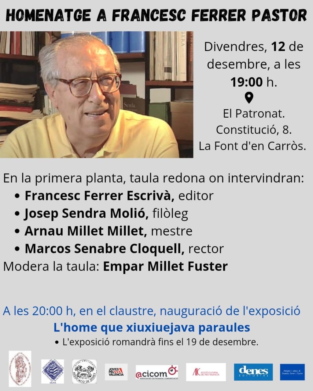 El mes de juny es va commemorar el 25é aniversari de la mort de Francesc Ferrer Pastor a l’Octubre Centre de Cultura Contemporània de València, i aquest divendres, es farà un homenatge a “l’home que xiuxiuejava paraules” a la Font d’en Carròs (la Safor), on va nàixer el 13 de desembre del 1918, tot just fa 107 anys. En l’acte, que tindrà lloc al Patronat a les 19 hores, hi participaran l’editor Francesc Ferrer Escrivà, el filòleg Josep Sendra Molió, el mestre Arnau Millet Millet, el rector Marcos Senabre Cloquell, moderats per Empar Millet Fuster. Posteriorment, a les 20h, al claustre s’inaugurarà una exposició dedicada al lexicògraf, que es podrà visitar fins al dia 19 d’aquest mes.