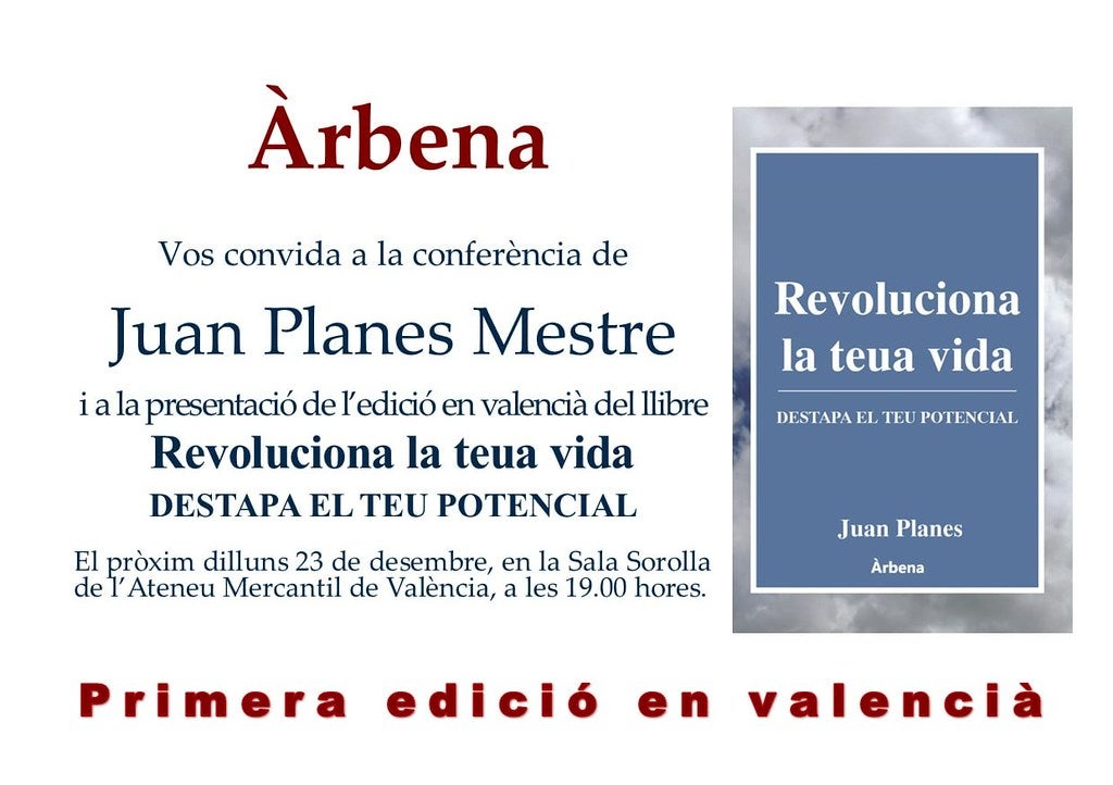 Juan Planes presenta, este dilluns 23 de desembre, l’edició en valencià del llibre ‘Revoluciona la teua vida’, un manual on mostra “un sistema d’entrenament pràctic i complet en les habilitats i estratègies que la ciència i la pràctica han demostrat més eficaces per a augmentar el teu nivell de felicitat i optimitzar el teu rendiment professional”.