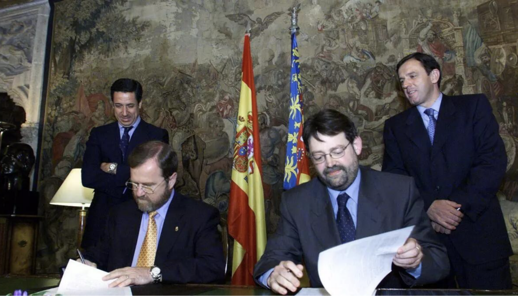 Acte de creació de l’AVL (2021). PP (Eduardo Zaplana i Alejandro Font de Mora) i PSPV-PSOE (Joan Ignasi Pla i Ximo Puig) signen l’acord de constitució. D’aquelles noces aquests confits | Alberto Saiz.