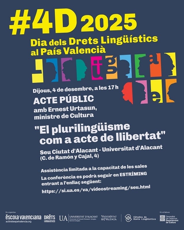 Cartell de l’acte en commemoració del Dia dels Drets Lingüístics celebrat el 4 de desembre a la Seu Universitària Ciutat d’Alacant en què participà el ministre Ernest Urtasun.