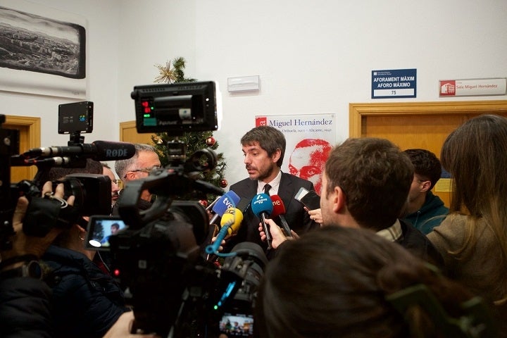 El ministre de Cultura espanyol Ernest Urtasun atenent als mitjans de comunicació | Taller d’Imatge UA.