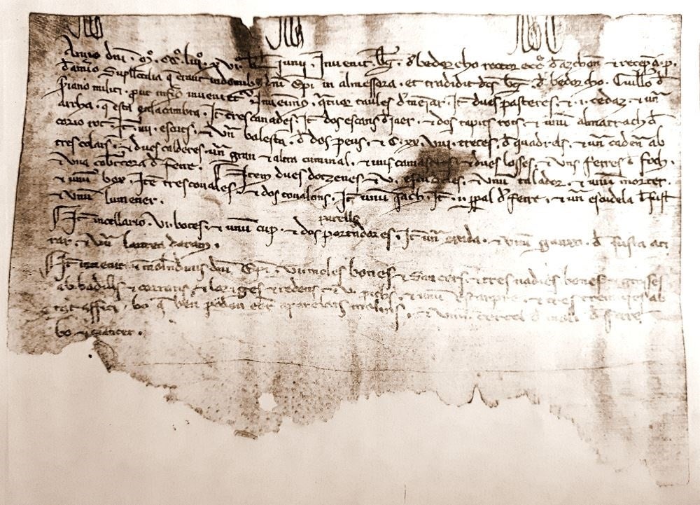 El document ―primer testimoni en «valencià»!― al qual es referí el Sr. Urtasun el donà a conèixer Vicent Garcia Edo, professor d’Història del Dret a la Universitat Jaume I de Castelló de la Plana a les Primeres Jornades d’Història d’Almassora, en setembre de 2017. El Sr. Garcia Edo hi donà a conèixer un document en llatí datat en aquesta població de la Plana Alta, que ―oh casualitat!― incloïa un fragment escrit en la llengua vulgar dels conqueridors, en la llengua de Tortosa, que, com tothom sap, és el català. El bisbat de Tortosa s’estenia, fins a temps ben recents, fins a Almenara, i en concret Almassora, de nom amb tantes reminiscències andalusines (de l’àrab andalusí al-mahsora, «l’estreta»), fou conquerida pels catalanoaragonesos de Jaume I en 1234 i donada al bisbe tortosí Ponç de Torrella. Explica el document que aquell 17 de maig de 1253, trobà Berenguer del Bedorc (Berengarius de Bedorcho), que era rector de l’església d’Ascó (Azchone, a la Ribera de l’Ebre), i rebé de Pere d’Amer (P. de Amerio) els mobles que eren a la casa del bisbe a Almassora (supellectilia que erant in domibus episcopi in Almessora). Berenguer del Bedorc trobà els mobles següents que lliurà al cavaller Guillem Sarrià (Guillelmus Seriano). I a partir d’ací s’inicia l’inventari, en català: «Et invenimus, quatuor taules de menjar. Item dues pasteres e .I. cedaz, e una archa que està en la cambra…, etc.». Fixeu-vos-hi: un senyor del Bedorc, que és una petita població del municipi de Piera (Anoia), i que és rector del poble d’Ascó, rep d’un tal Pere d’Amer, que és una població de la Selva, uns béns que després lliura a un cavaller de cognom Sarrià, un conegut llinatge barceloní. Clarament, tres individus de la Catalunya Principat. I resulta que tots tres parlen «valencià». Òbviament, sí; parlen el català que, contra els que hui dia el voldrien extingit, encara és la llengua pròpia i genuïna dels valencians.