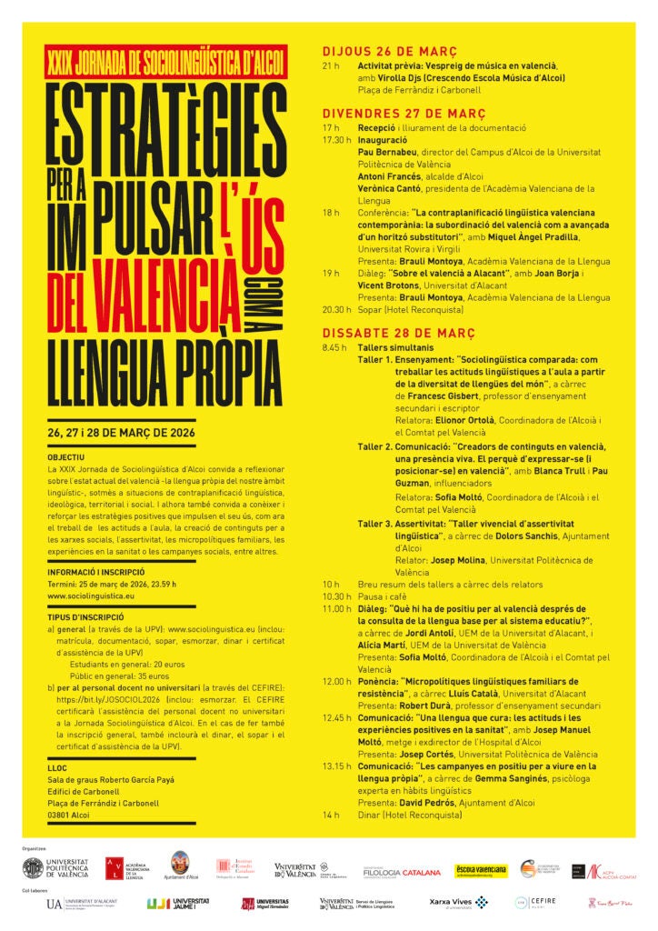 Ja són 29 anys de Jornades de Sociolingüística d’Alcoi. Un referent consolidat en el qual podeu participar de dues formes, el cap de setmana del 27 i el 28 de març. Podeu fer la inscripció per mitjà de la Universitat Politècnica de València (la matrícula simbòlica dona dret a esmorzar i dinar) o, si sou docents i voleu certificat d’assistència, via la pàgina de cursos del CEFIRE d’Alcoi.