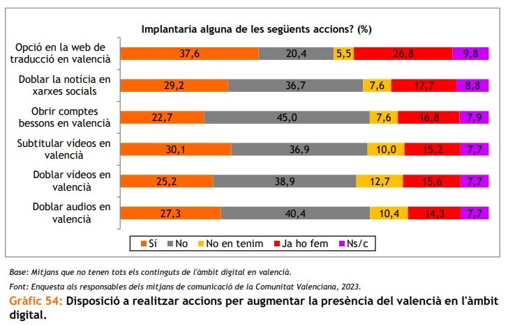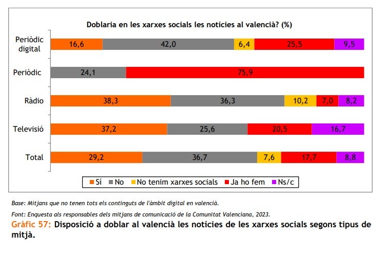 Aquests responsables també són preguntats per la proposta de doblar vídeos publicats digitalment al valencià, però el 39% no en són partidaris.
