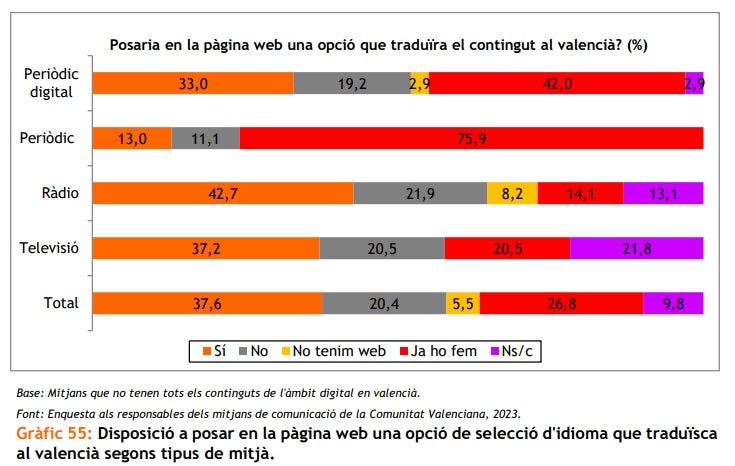 Segons l’estudi, als seus suports digitals els mitjans tenen «més màniga ampla per a realitzar accions que faciliten la igualtat lingüística, ja que la tecnologia permet certes adaptacions que no resulten excessivament costoses». En canvi, només una de les opcions proposades amb aquesta intenció pels autors de l’estudi compta amb més partidaris que detractors. Es tracta de l’opció de poder veure la pàgina web amb els continguts traduïts al valencià.