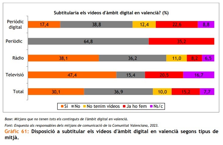 Pel que fa a subtitular vídeos en valencià, el 36,9% dels responsables dels mitjans consultats no veuen amb bons ulls aquesta opció. Els més partidaris són els de la televisió (47,4%), i els menys favorables són els responsables dels periòdics, que es refereixen a la versió digital dels seus mitjans (64,8%).