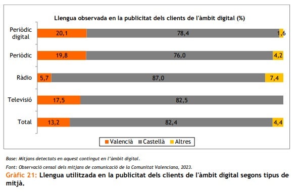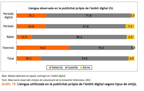 Segons l’estudi, les empreses d’informació massiva del País Valencià que es promocionen en l’àmbit digital en castellà són el 74,8% del total, especialment les ràdios, que arriben al percentatge del 80,6%. El balanç, segons els investigadors, resultaria més equilibrat en les televisions, on el valencià té una quota de pantalla en la publicitat interna del mitjà del 44,6%.