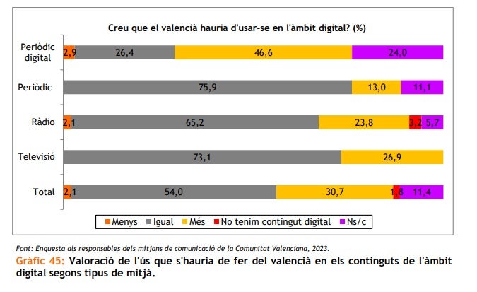 Segons l’estudi, «els responsables dels mitjans tenen clar que el valencià queda eclipsat en les versions digitals dels seus mitjans». 31 de cada 100 consultats consideren que l’haurien d’utilitzar més, i només el 2,1% diuen que l’haurien d’utilitzar menys. Els investigadors també apunten que «el nivell de conscienciació lingüística en aquest punt resulta clarament superior en els periòdics digitals», amb el 46,6% dels consultats favorables a incrementar l’ús del valencià, mentre que en el cas dels suports en paper només el 13% dels responsables comparteixen aquesta consideració.