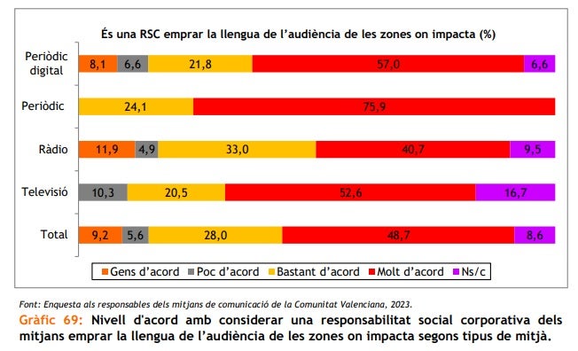 Segons l’estudi, cada vegada són més empreses les que posen en marga estratègies de Responsabilitat Social Corporativa. «Sota aquest prisma, un mitjà de comunicació que impacta sobre els ciutadans d’una zona valencianoparlant oferint la seua informació íntegrament en castellà, sense tenir en compte les repercussions que aquesta activitat està tenint en un lloc on el valencià és una llengua minoritzada, podria classificar-se, per definició, com una empresa escassament responsable amb l’entorn en el qual desenvolupa la seua activitat i, molt especialment, amb el seu grup d’interés més important: l’audiència».