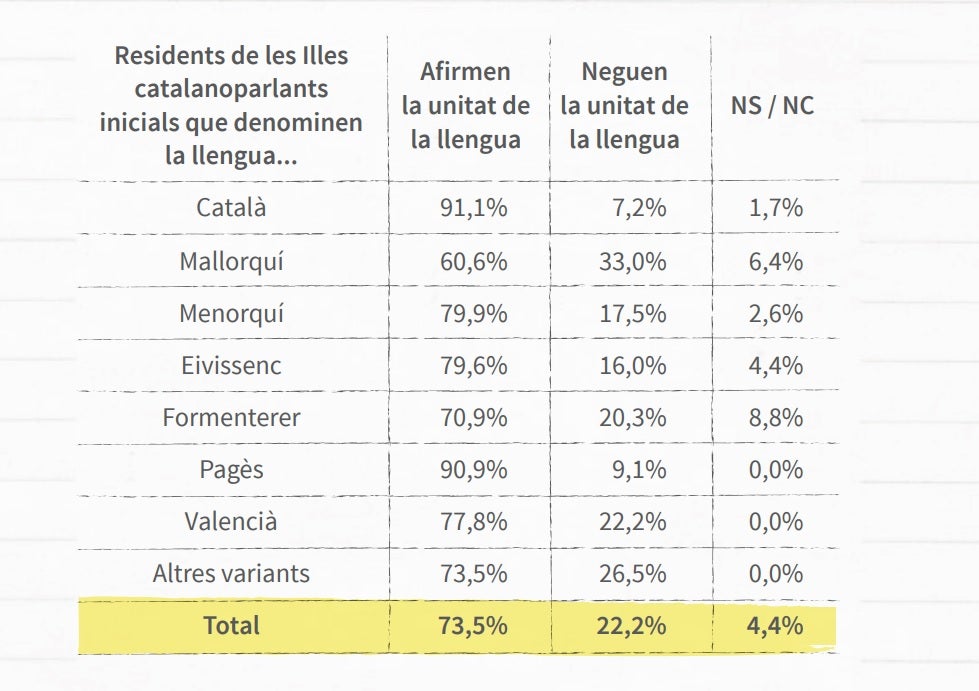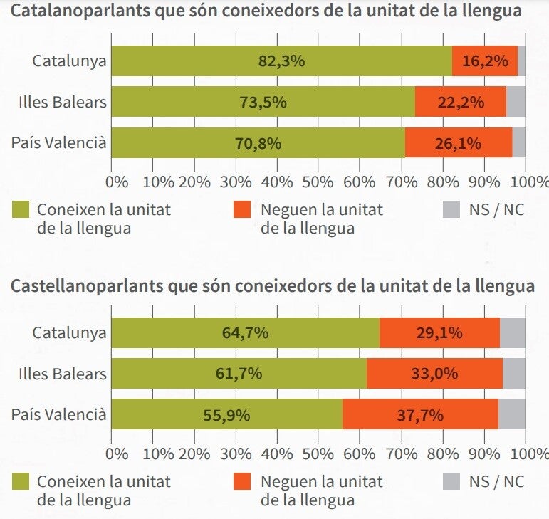 Tal com indica l’ONG del català, «contràriament al que pot semblar per la força dels partits que neguen la unitat de la llengua catalana al País Valencià i a les Illes, la majoria de valencians i d’illencs són coneixedors que les seues variants lingüístiques autòctones i les de Catalunya són parts d’una única llengua». Per territoris, el 82,3% dels catalanoparlants de Catalunya i el 65,7% dels castellanoparlants ho tenen clar. A les Illes el percentatge és del 73,5% dels catalanoparlants i del 61,7% dels castellanoparlants, mentre que al País Valencià ho tenen clar el 70,8% dels catalanoparlants i el 55,9% dels castellanoparlants.