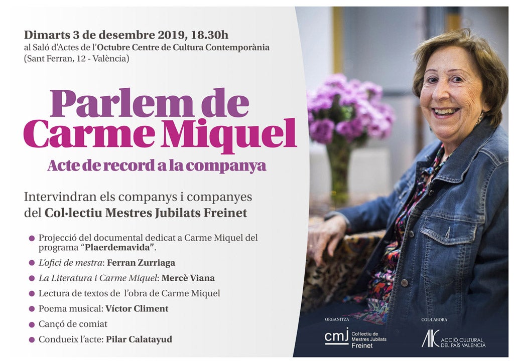Sota el títol “Parlem de Carme Miquel”, la jornada en record de la mestra valenciana comptarà amb les intervencions de Ferran Zurriaga, Mercè Viana, Víctor Climent i Pilar Calatayud. A més a més, es projectarà el documental dedicat a Carme Miquel del programa Plaerdemavida, i es recitaran alguns dels seus textos més emblemàtics.