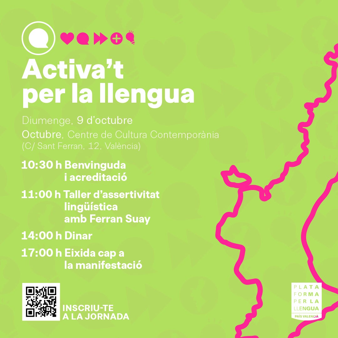 Plataforma per la Llengua celebrarà la II Trobada de socis i voluntariat el proper diumenge 9 d’Octubre a l’Octubre Centre de Cultura Contemporània (carrer de Sant Ferran, 12) de València. La jornada «Activa’t per la llengua» tindrà una xerrada sobre assertivitat lingüística impartida pel professor Ferran Suay, un dinar de germanor i la participació en la manifestació convocada per la Comissió 9 d’Octubre. Qui vulga participar en la trobada de Plataforma per la Llengua, es pot inscriure a través d’aquest enllaç.