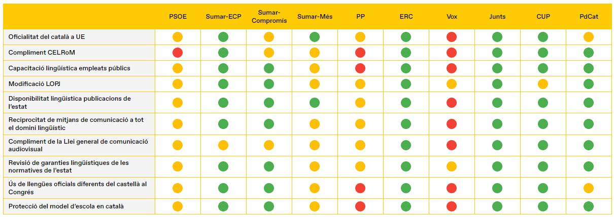 Així, la guia permet descobrir el posicionament d’Esquerra Republicana, Junts, la CUP, el PDeCat, el PSOE, el PP, Vox i les tres candidatures de Sumar a Catalunya, el País Valencià i les Illes Balears: Sumar-En Comú Podem, Sumar-Compromís, i Sumar-Més. Pel que fa al PSOE, igual que el PP i Vox, no presenta un programa propi per als diferents territoris catalanoparlants, sinó que té un únic programa per a tot l’Estat espanyol i evita posicionar-se sobre aquestes qüestions: es limita a parlar del PERTE Nueva Economía de la Lengua, i de la digitalització i el foment del castellà com a patrimoni de l’Estat, però pràcticament no diu res sobre la resta de llengües.