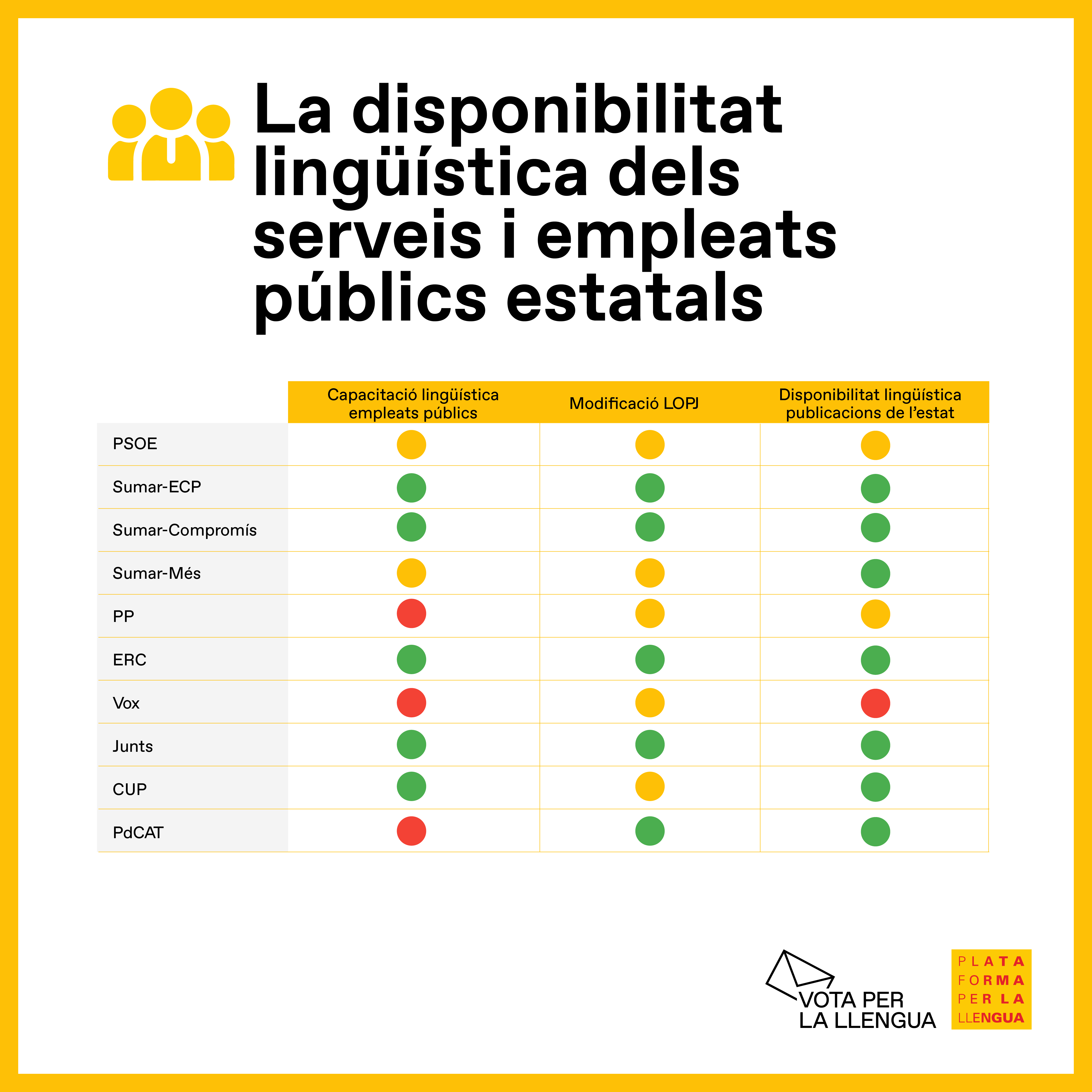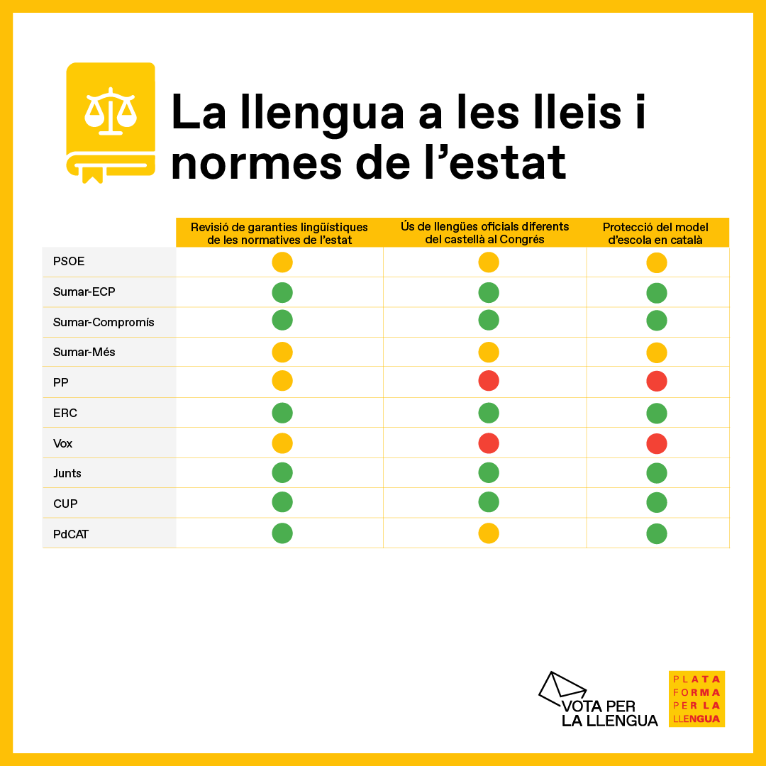 Amb la voluntat que la ciutadania vote amb consciència lingüística, l’entitat comença a difondre diferents infografies en què es pot veure el posicionament de cada partit respecte a les deu propostes de l’entitat. A través d’una escala de colors, s’assenyalen en verd les propostes sobre les quals els partits es posicionen clarament a favor, en groc s’indiquen les mesures en què els partits no es posicionen, i en roig les accions que els partits volen revertir o rebutgen explícitament.