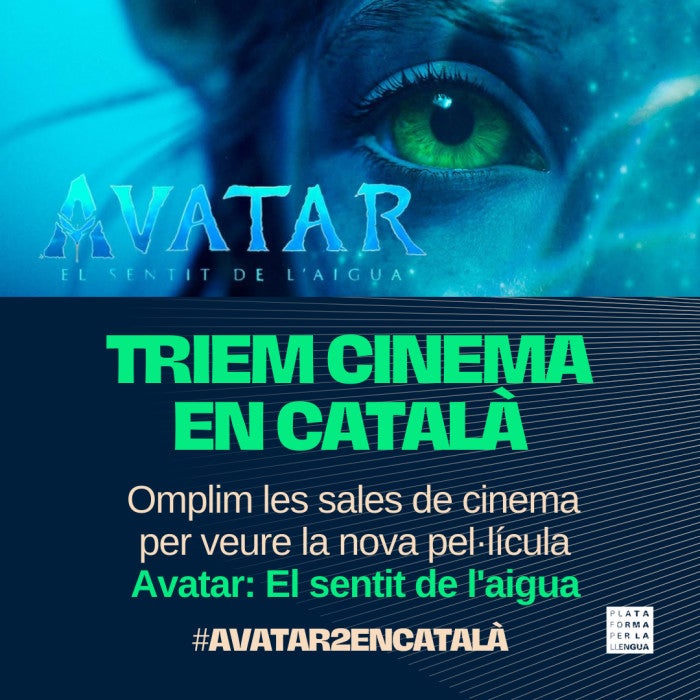 Plataforma per la Llengua denuncia que la programació provisional de la majoria de cinemes de Catalunya arracona la versió en català d’una de les pel·lícules, previsiblement, més taquilleres de l’any: Avatar: el sentit de l’aigua, que s’estrena el divendres 16 de desembre. L’entitat anima els cinemes a rectificar i fa una crida a la ciutadania per comprar entrades de manera anticipada a les sessions en català i demostrar que el doblatge en català té demanda. Per a Plataforma per la Llengua, la resposta ciutadana és clau perquè els cinemes vegen la conveniència de programar films en català, però encara ho és més que el Govern català faça complir la Llei del cinema de Catalunya. Tot i que el 2017 una sentència del Tribunal Constitucional va rebaixar del 50% al 25% el percentatge obligatori de projeccions en català per a les pel·lícules estrenades doblades o subtitulades, aquest percentatge continua ben lluny del percentatge actual d’oferta en català als cinemes, que és del 3%. Si s’aplicara la llei, el 25 % de les projeccions d’Avatar: el sentit de l’aigua haurien de ser en la llengua del país, calculen des de l’ONG del català.