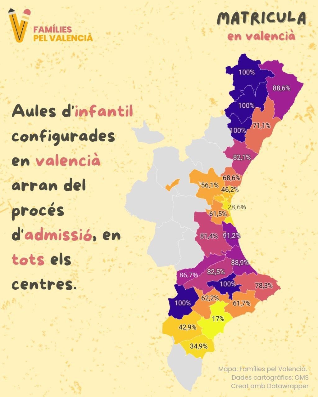 En concret, assenyala Famílies pel Valencià, hi haurà “un 56% d’aules en valencià per un 44% en castellà“. A més, destaca una altra dada: “El 70% de les aules constituïdes a partir del procés d’admissió en Infantil (2 o 3 anys depenent del centre) tindran el valencià com a llengua base”. Un fet que, continua, “contrasta amb el 23% de les aules que seran en valencià a l’escola concertada“.