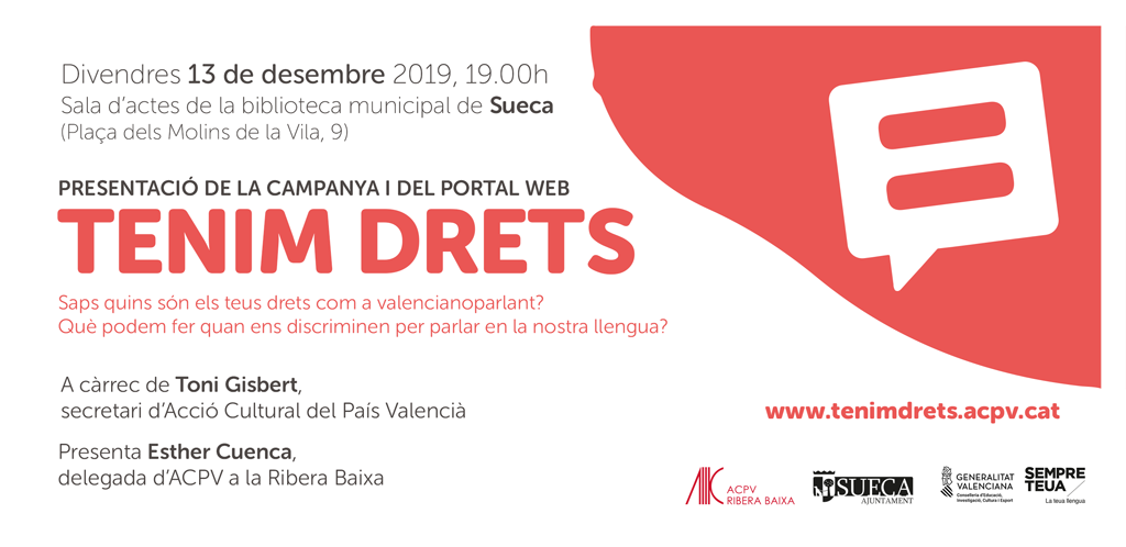 La presentació a Sueca de la campanya i el portal web Tenim Drets serà el pròxim 13 de desembre, a les 19h, a la sala d’actes de la biblioteca municipal de la localitat. Comptarà amb la participació de Toni Gisbert, secretari d’ACPV, i Esther Cuenca, delegada d’ACPV a la comarca de la Ribera Baixa.